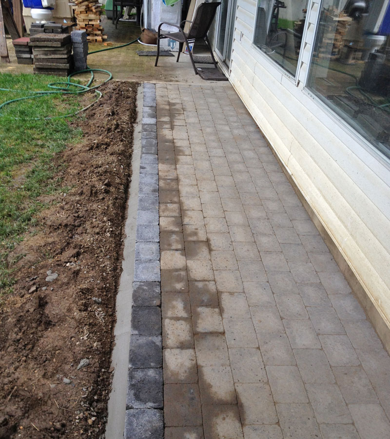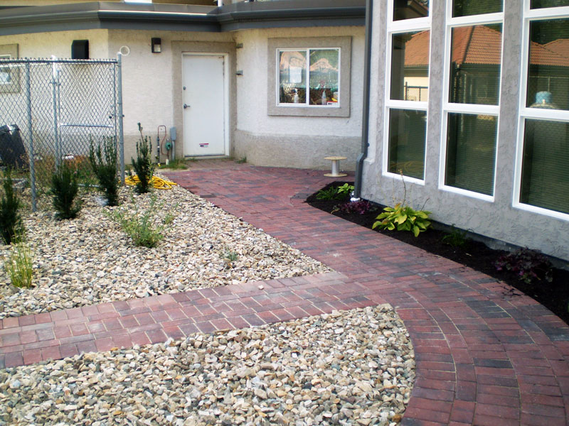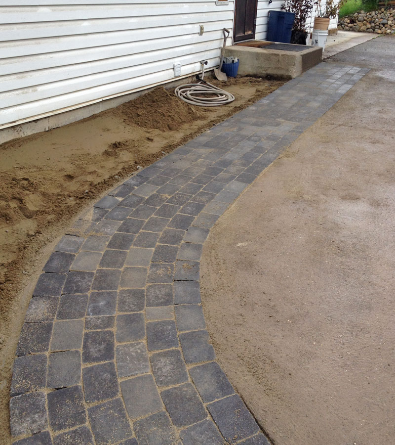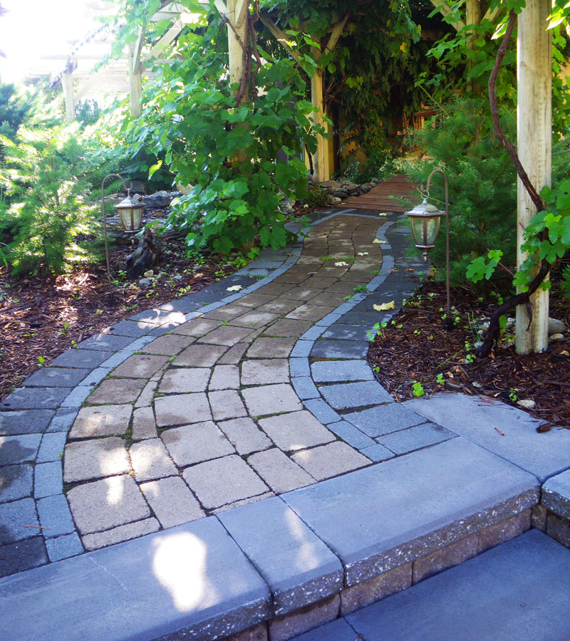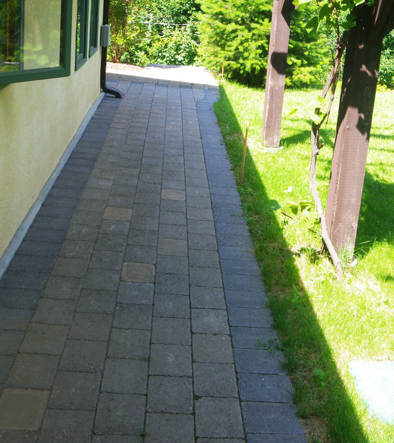 Narrow Walkway - inlay color earth tone with perimeter brick (soldier course) as a dark grey color for contrast.