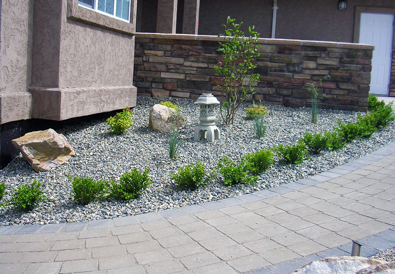 Network of paths, surrounded by planter areas & ornaments (rock).